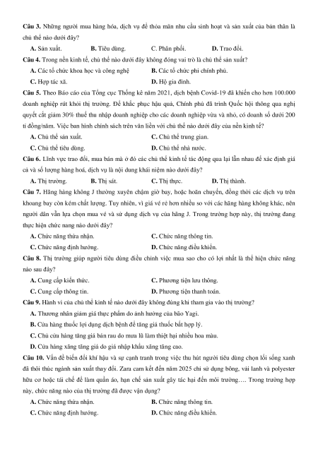 Câu 18. Các nghệ nhân làng nghề Bát Tràng đóng vai trò là chủ thể nào dưới đây? A. Tiêu dùng. B. Nhà nước. C. Sản xuất. D. Phân phối.