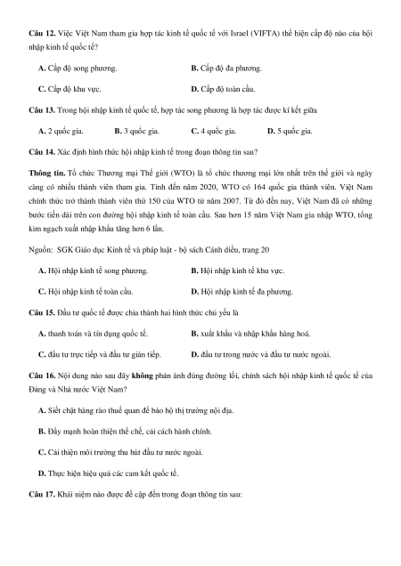 Câu 12. Việc Việt Nam tham gia hợp tác kinh tế quốc tế với Israel (VIFTA) thể hiện cấp độ nào của hội nhập kinh tế quốc tế?