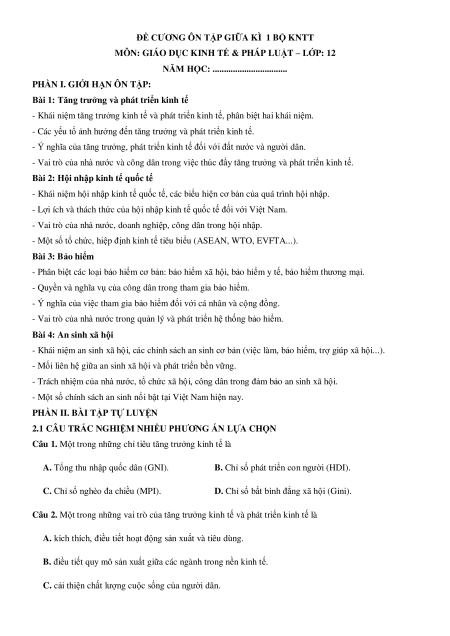 Đề cương ôn tập giữa học kì 1 Kinh tế pháp luật 12 Kết nối tri thức