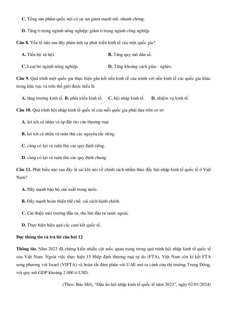Câu 9. Quá trình một quốc gia thực hiện gắn kết nền kinh tế của mình với nền kinh tế các quốc gia khác