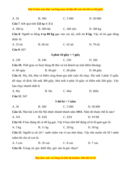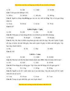 để chạy về đích, Hà mất 380 giây, Mai mất 4 phút 10 giây và Hiền mất 260 giây. Vậy bạn chạy nhanh nhất là A. My B. Hà C. Mai D. Hiền Câu 12. Số? 5 thế kỉ = ? năm A. 50 B. 500 C. 5 000 D. 50 000