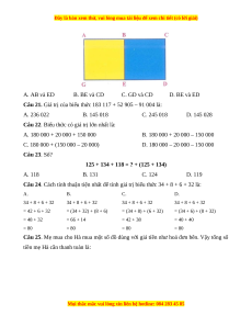 Câu 21. Giá trị của biểu thức 183 117 + 52 905 – 91 004 là: A. 236 022 B. 145 018 C. 245 018 D. 145 028