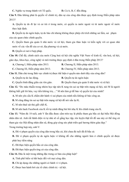 Câu 9. Đâu không phải là quyền về chính trị, dân sự của công dân được quy định trong Hiến pháp năm 2013?