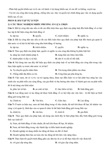 Câu 10: Theo quy định của pháp luật, quyền bình đẳng trong trên lĩnh vực chính trị thể hiện ở việc các