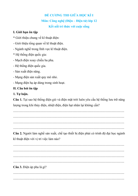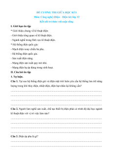 Đề cương ôn tập giữa kì 1 Công nghệ 12 Điện, Điện tử Kết nối tri thức