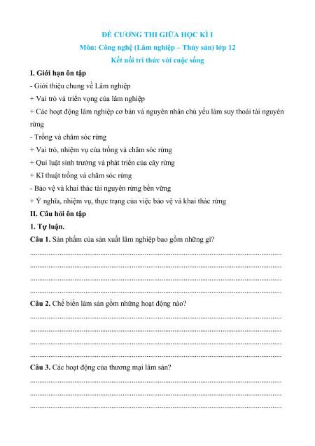 Đề cương ôn tập giữa kì 1 Công nghệ 12 Lâm nghiệp, thủy sản Kết nối tri thức