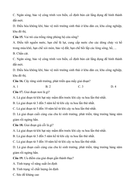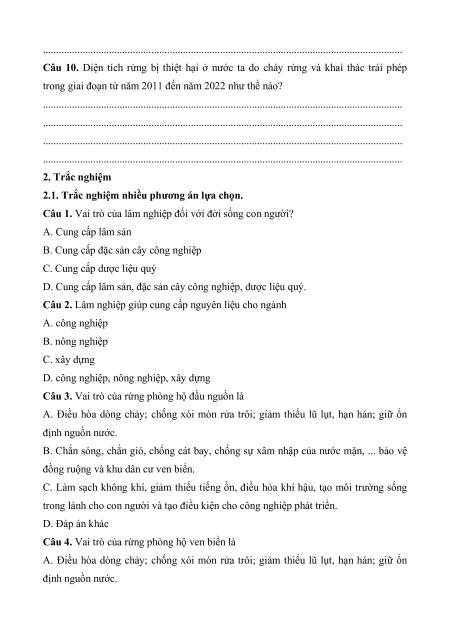 Câu 1. Vai trò của lâm nghiệp đối với đời sống con người? A. Cung cấp lâm sản