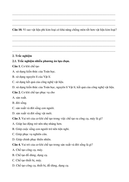 Câu 2. Cơ khí chế tạo phục vụ cho A. sản xuất. B. đời sống.