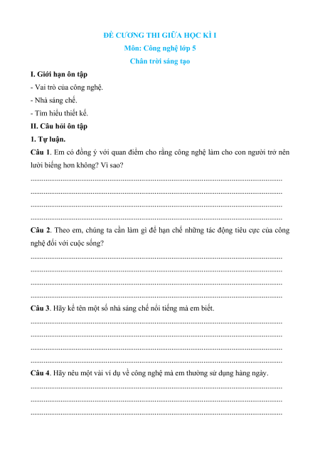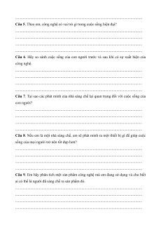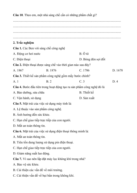 - Vai trò của công nghệ. - Nhà sáng chế. - Tìm hiểu thiết kế. II. Câu hỏi ôn tập 1. Tự luận.