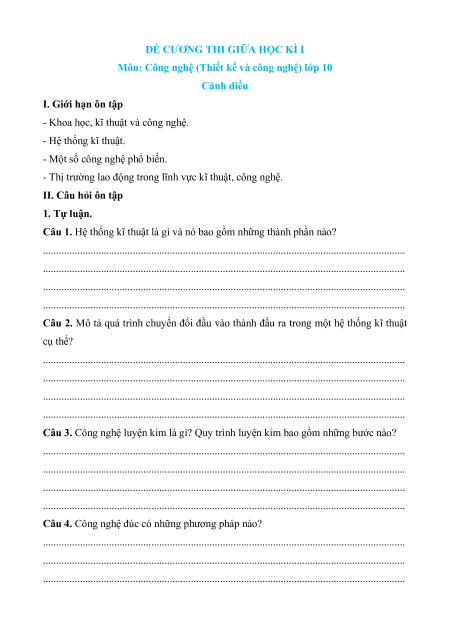 - Tailieugiaovien.com.vn giới thiệu bộ Đề cương ôn tập Giữa kì 1 Công nghệ 10 Thiết kế và công nghệ Cánh diều theo cấu trúc mới nhất nhằm giúp Giáo viên có thêm tài liệu tham khảo ra đề thi Công nghệ 10.