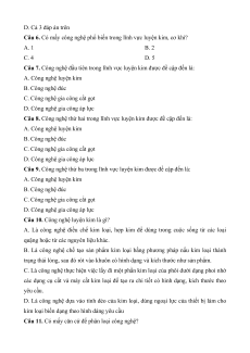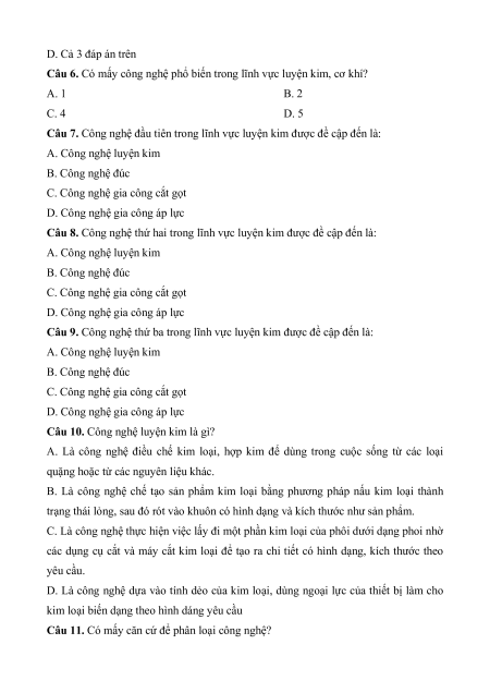 Câu 6. Có mấy công nghệ phổ biến trong lĩnh vực luyện kim, cơ khí? A. 1 B. 2 C. 4 D. 5