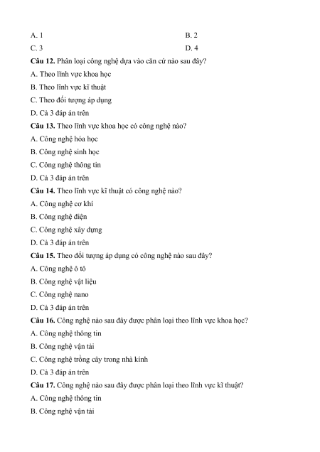 Câu 11. Có mấy căn cứ để phân loại công nghệ?