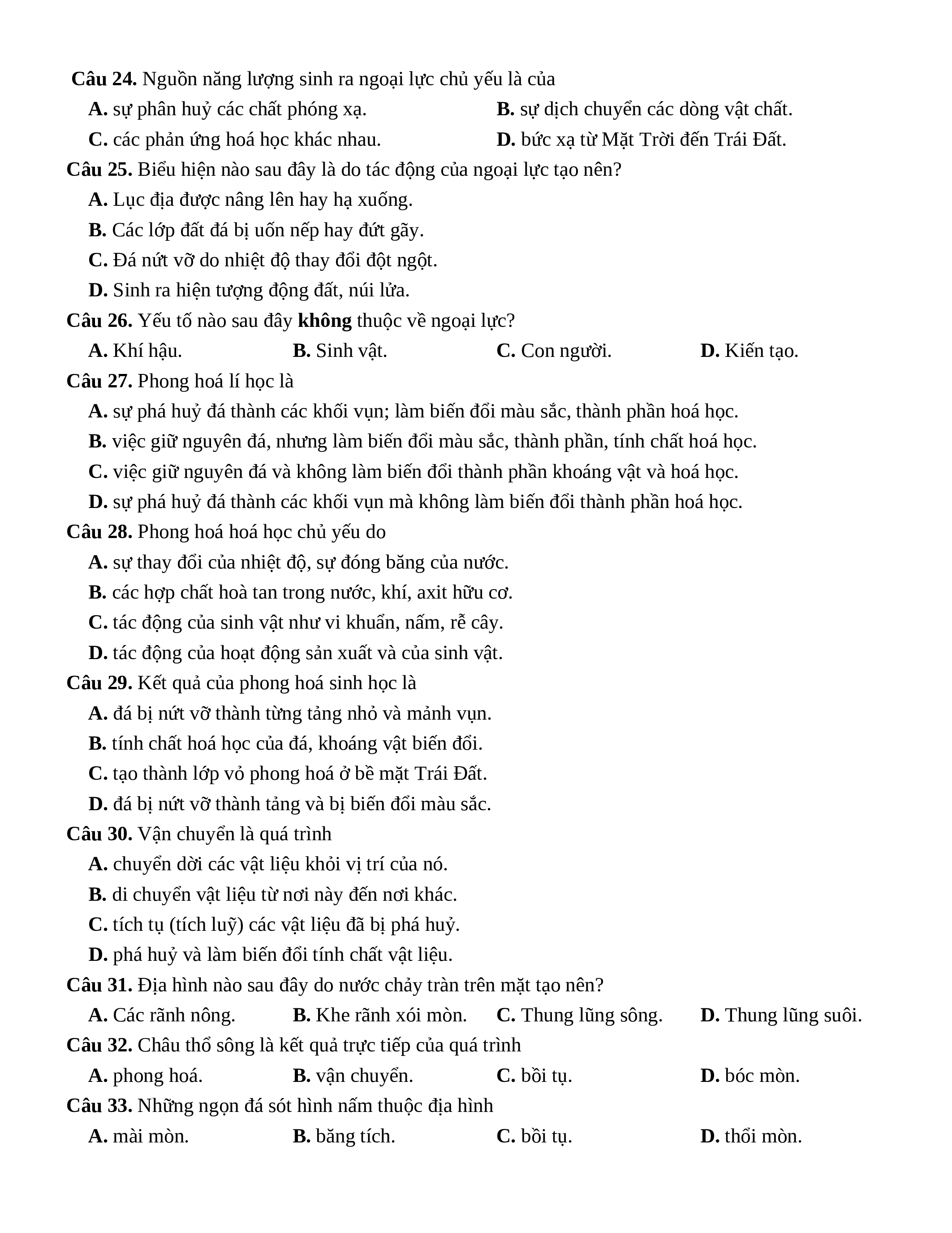 Câu 21. Biểu hiện nào sau đây không phải là do tác động của nội lực?