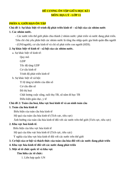 Đề cương ôn tập Giữa kì 1 Địa lí 11 Kết nối tri thức