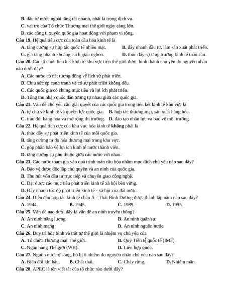 Câu 16. Các tổ chức liên kết kinh tế khu vực trên thế giới thường được thành lập bởi các quốc gia có