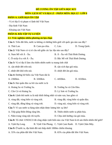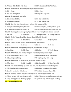 Câu 1: Trên đất liền, nước ta không có đường biên giới với quốc gia nào sau đây? A. Thái Lan. B. Cam-pu-chia. C. Lào. D. Trung Quốc.