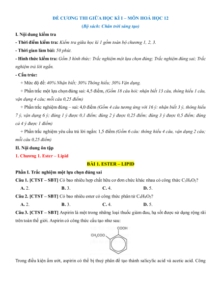 ĐỀ CƯƠNG THI GIỮA HỌC KÌ I – MÔN HOÁ HỌC 12