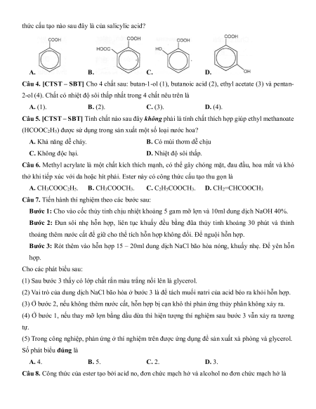 Câu 2. [CTST – SBT] Có bao nhiêu ester có công thức phân tử C4H8O2? A. 2. B. 3. C. 4. D. 5.