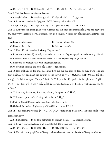 Câu 10. Ester nào sau đây tác dụng với NaOH thu được ethyl alcohol? A. CH3COOC2H5. B. CH3COOC3H7. C. C2H5COOCH3. D. HCOOCH3.