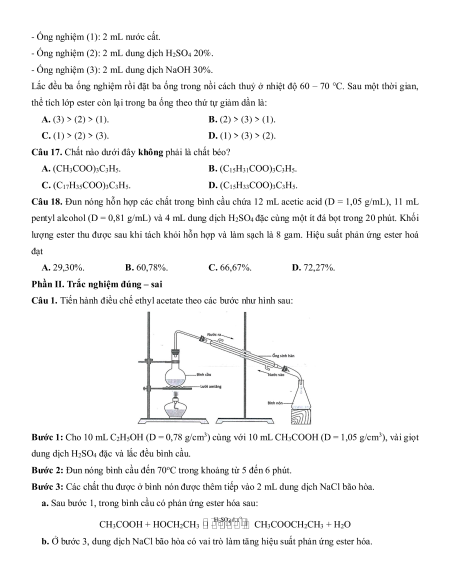 Câu 18. Đun nóng hỗn hợp các chất trong bình cầu chứa 12 mL acetic acid (D = 1,05 g/mL), 11 mL