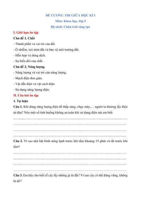 Đề cương ôn tập giữa kì 1 Khoa học lớp 5 Chân trời sáng tạo