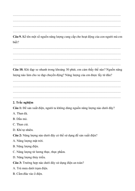 Câu 9. Kể tên một số nguồn năng lượng cung cấp cho hoạt động của con người mà em biết?