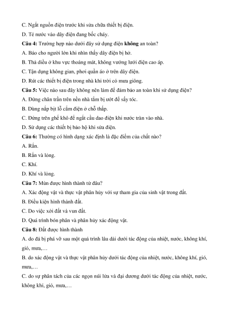 Câu 6: Thường có hình dạng xác định là đặc điểm của chất nào? A. Rắn. B. Rắn và lỏng. C. Khí. D. Khí và lỏng.