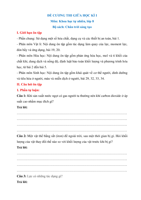 Đề cương ôn tập Giữa kì 1 Khoa học tự nhiên 8 Chân trời sáng tạo