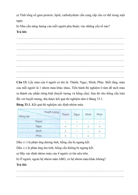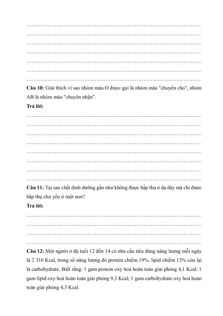 Câu 12: Một người ở độ tuổi 12 đến 14 có nhu cầu tiêu dùng năng lượng mỗi ngày