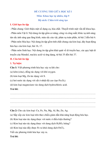 Đề cương ôn tập Giữa kì 1 Khoa học tự nhiên 9 Chân trời sáng tạo