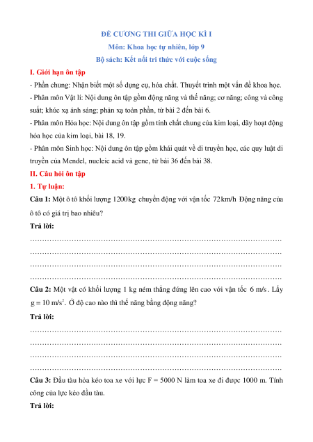 Đề cương ôn tập Giữa kì 1 Khoa học tự nhiên 9 Kết nối tri thức