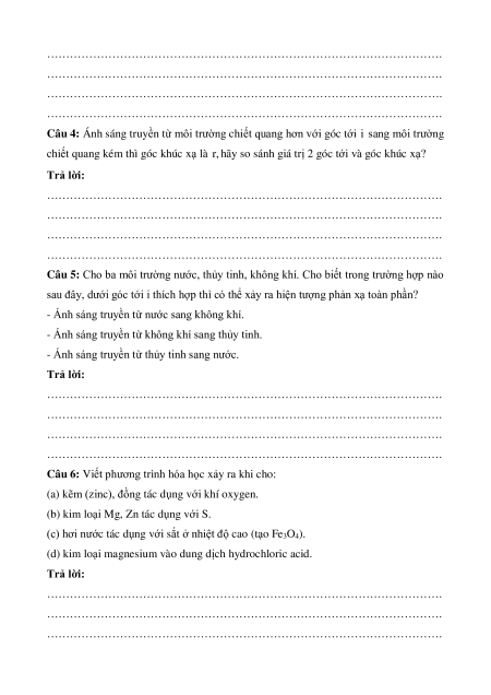 Câu 4: Ánh sáng truyền từ môi trường chiết quang hơn với góc tới i sang môi trường
