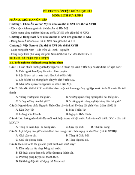 Đề cương ôn tập Giữa kì 1 Lịch sử 8 (dùng chung cả 3 sách)