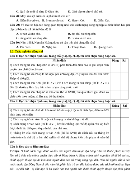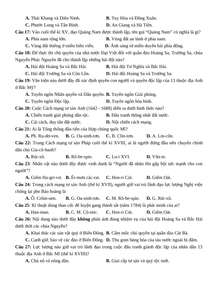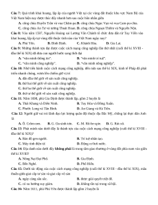 Câu 30: Năm 1558, Nguyễn Hoàng được cử vào trấn thủ vùng đất nào? A. Phú Yên. B. Nghệ An. C. Thuận Hóa. D. Quảng Nam.