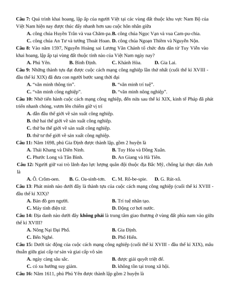 Câu 14: Địa danh nào dưới đây không phải là trung tâm giao thương ở vùng đất phía nam vào giữa thế kỉ XVIII?