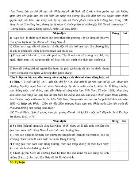 Câu 1: Đọc các nhận định sau, trong mỗi ý a), b), c), d), thí sinh chọn đúng hoặc sai. Nhận định Đúng Sai