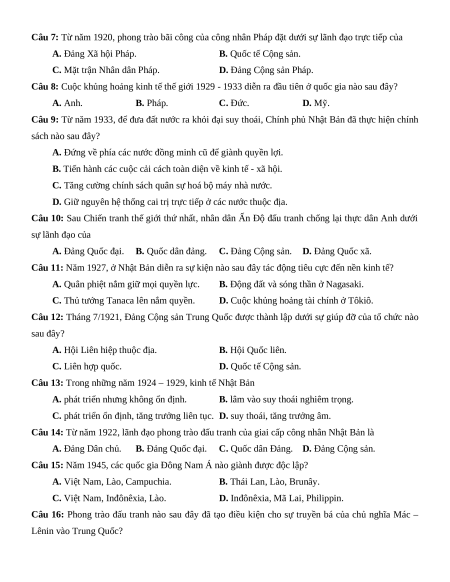 Câu 14: Từ năm 1922, lãnh đạo phong trào đấu tranh của giai cấp công nhân Nhật Bản là A. Đảng Dân chủ.