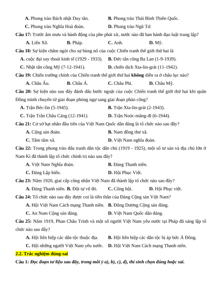 Câu 16: Phong trào đấu tranh nào sau đây đã tạo điều kiện cho sự truyền bá của chủ nghĩa Mác – Lênin vào Trung Quốc?