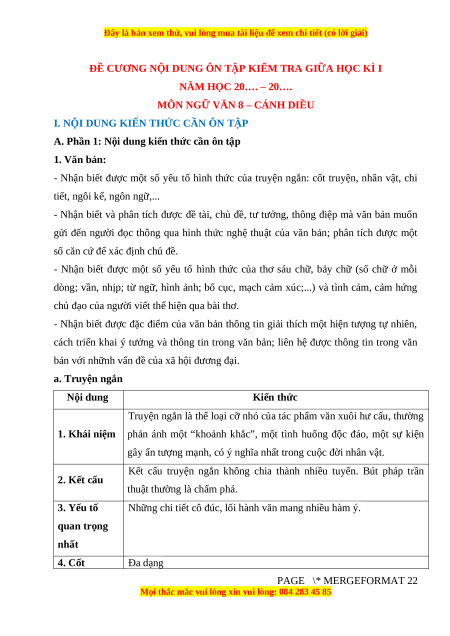 Đề cương ôn tập giữa kì 1 Ngữ văn 8 Cánh diều