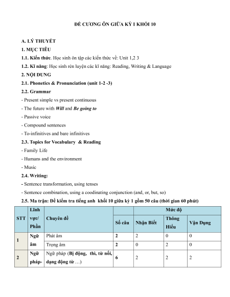 ĐỀ CƯƠNG ÔN GIỮA KỲ I KHỐI 10 A. LÝ THUYẾT 1. MỤC TIÊU