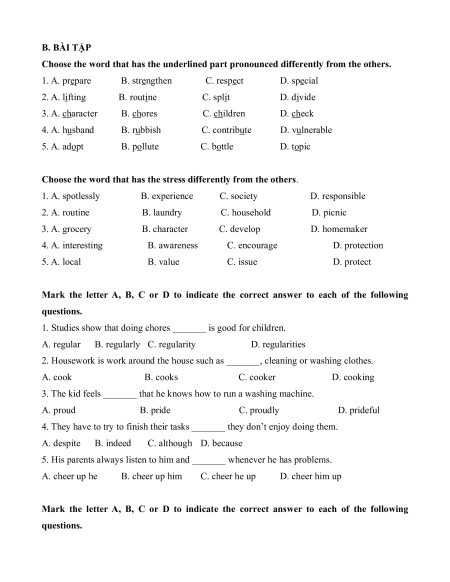 Choose the word that has the stress differently from the others. 1. A. spotlessly B. experience C. society D. responsible 2. A. routine B. laundry C. household D. picnic 3. A. grocery B. character C. develop D. homemaker 4. A. interesting B. awareness C. encourage D. protection 5. A. local B. value C. issue D. protect