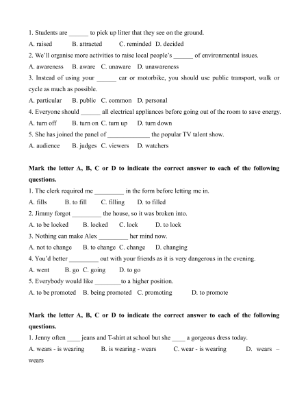 1. Students are ______ to pick up litter that they see on the ground. A. raised B. attracted C. reminded D. decided