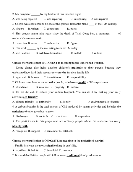 2.3. Topics for Vocabulary & Reading - Family Life - Humans and the environment - Music 2.4. Writing: