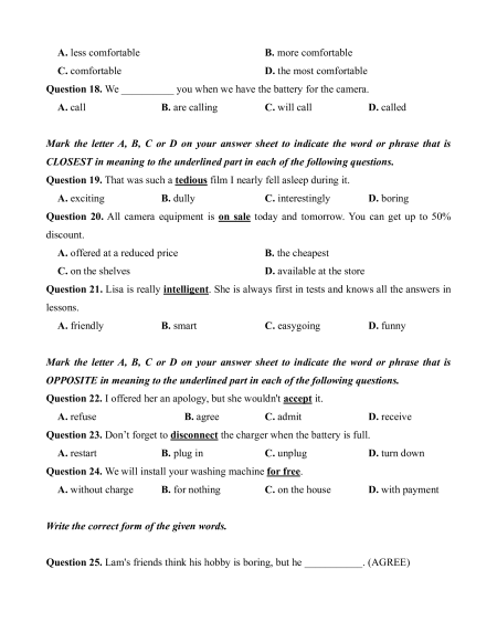 Question 17. These trainers are __________ of all three that I have tried on. A. less comfortable B. more comfortable C. comfortable D. the most comfortable