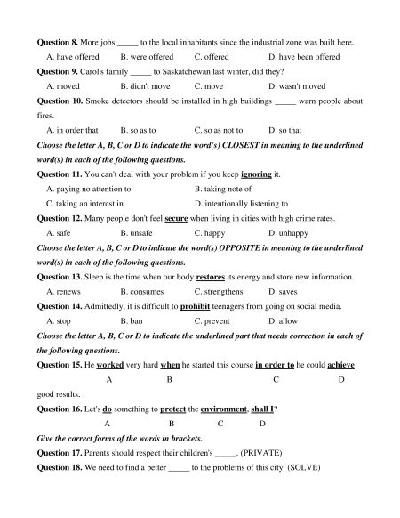 Question 8. More jobs _____ to the local inhabitants since the industrial zone was built here. A. have offered B. were offered C. offered D. have been offered