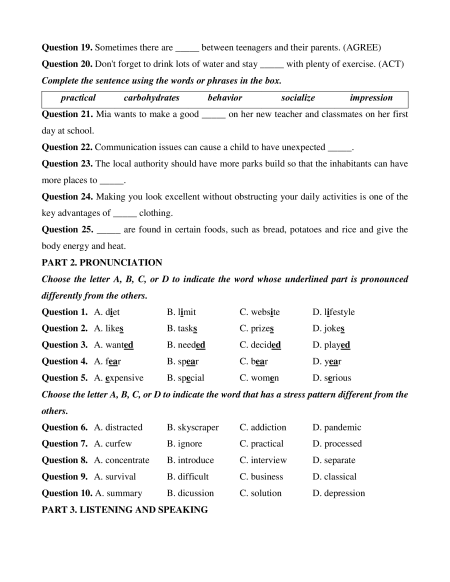 Question 25. _____ are found in certain foods, such as bread, potatoes and rice and give the body energy and heat. PART 2. PRONUNCIATION
