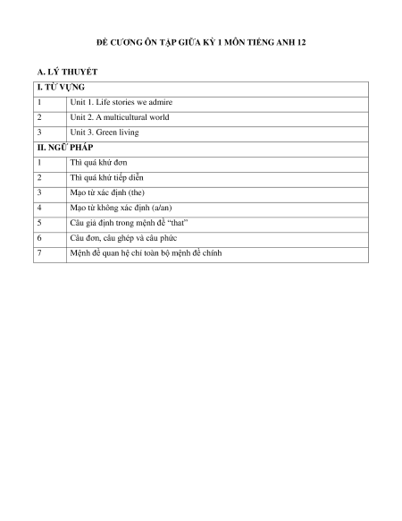 Unit 1. Life stories we admire 2 Unit 2. A multicultural world 3 Unit 3. Green living II. NGỮ PHÁP 1 Thì quá khứ đơn 2 Thì quá khứ tiếp diễn 3 Mạo từ xác định (the) 4