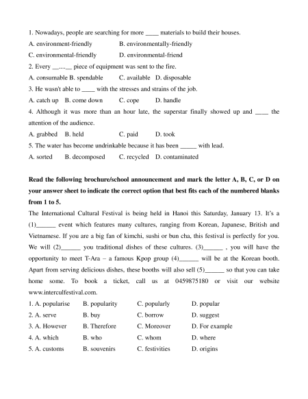 home some. To book a ticket, call us at 0459875180 or visit our website www.interculfestival.com. 1. A. popularise B. popularity C. popularly D. popular 2. A. serve B. buy C. borrow D. suggest 3. A. However B. Therefore C. Moreover D. For example 4. A. which B. who C. whom D. where 5. A. customs B. souvenirs C. festivities D. origins