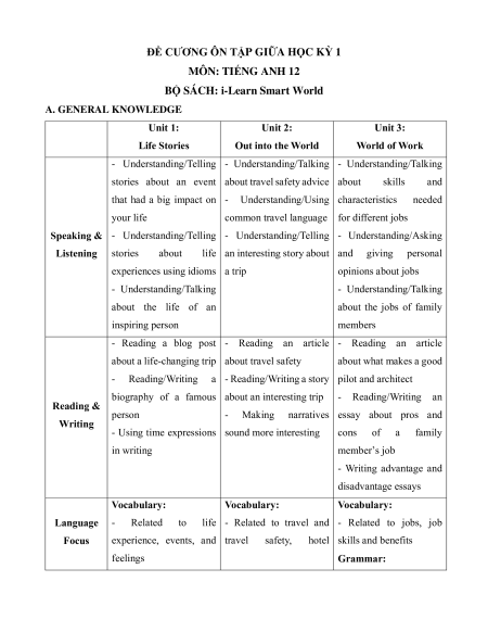 BỘ SÁCH: i-Learn Smart World A. GENERAL KNOWLEDGE Unit 1: Unit 2: Unit 3: Life Stories Out into the World World of Work