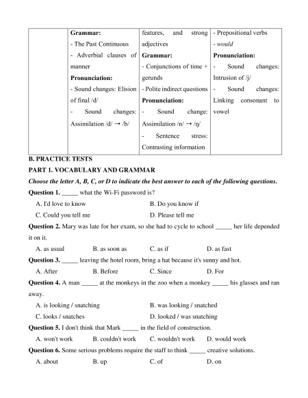 - Sound changes: Elision - Polite indirect questions - Sound changes: of final /d/ Pronunciation: Linking consonant to - Sound changes: - Sound change: vowel Assimilation /d/ ➝ /b/ Assimilation /n/ ➝ /ŋ/ - Sentence stress: Contrasting information B. PRACTICE TESTS